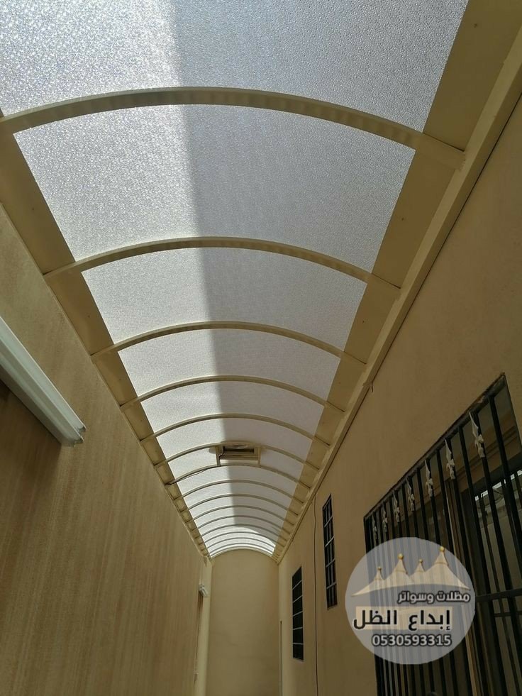 مظلات قوس بي في سي تركيب اجمل الانواع من المظلات القوسية للممرات وهذا احد الاشكال قد يبين ضواء خافت ومن المهم تحديد نوعية ولون التغطية يوجد اللون الغامق يوفر ظل كامل بدون ضواء ولك الخيار في اختيار النوعية المناسبة للمكان.